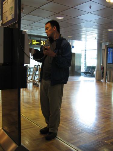Matt in Helsinki Airport, drinking beer bought with Finn Air voucher, calling the bank